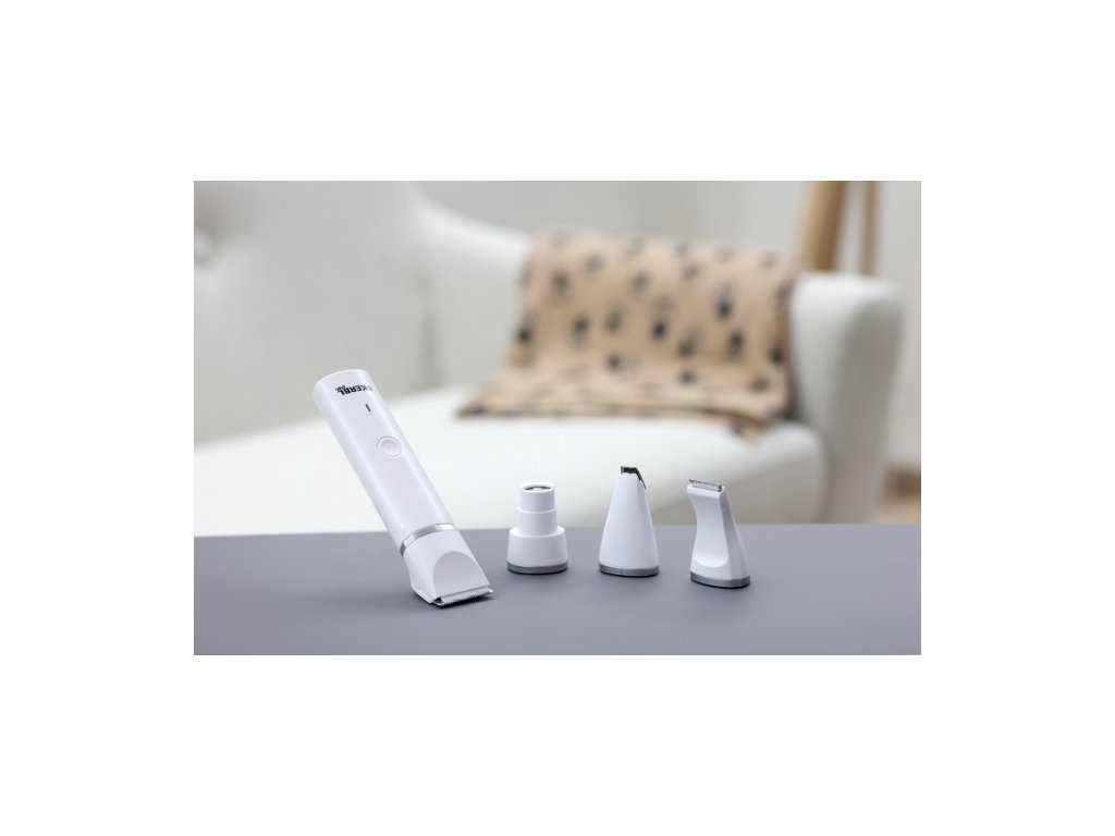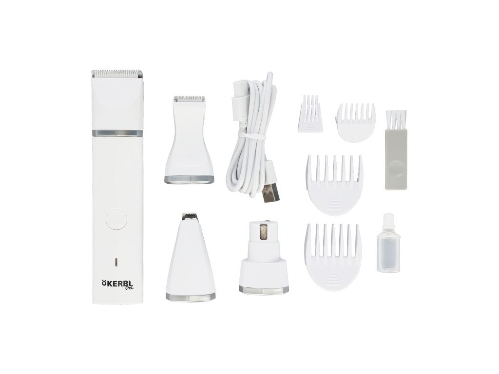 Stříhací strojek 4v1 pro psy a kočky s nástavci pro stříhání, holení a broušení drápků. Sada obsahuje stříhací hlavice pro stříhání větších ploch, holení menších, i detailní odholování a brusku na drápky. Strojek na stříhání psů 4v1 je ideální i pro těžko přístupná a citlivá místa jako jsou tlapky, obličej nebo uši. Hlavice jsou keramické a mají vynikající stříhací vlastnosti. Brusný kotouček je z oceli s diamantovým povrchem a má bezpečnostní kryt. Tento strojek na psy má výkonnou baterii a snadno dobíjí pomocí přiloženého USB kabelu. Při používání je velmi tichý a má nízké vibrace, aby zvířata zbytečně nestresoval.
